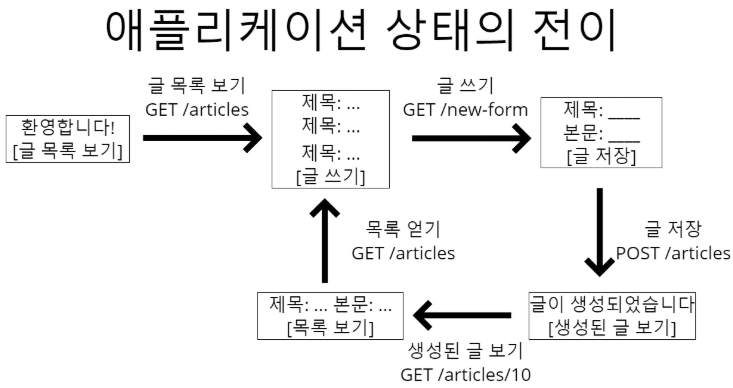 HATEOAS는 다음 그림과 같이 링크를 통해서 상태 전이가 되어야 한다는 것을 말한다.
